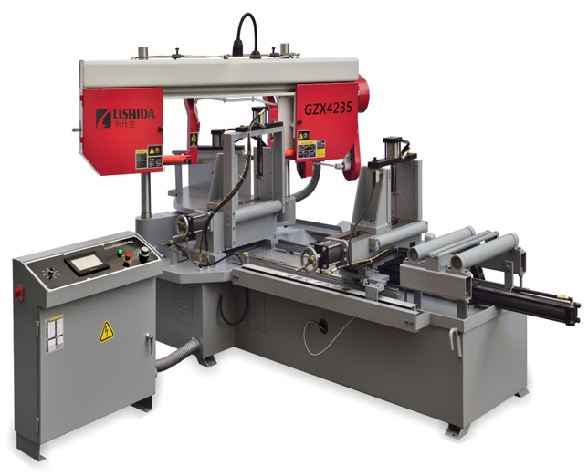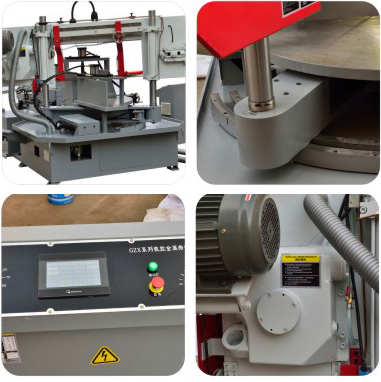 ·角度數控帶鋸床系列適用于大批量同規格材料鋸切,設備切斷速度快,高效 穩定、節能、節材,可配備小料成束裝夾裝置。